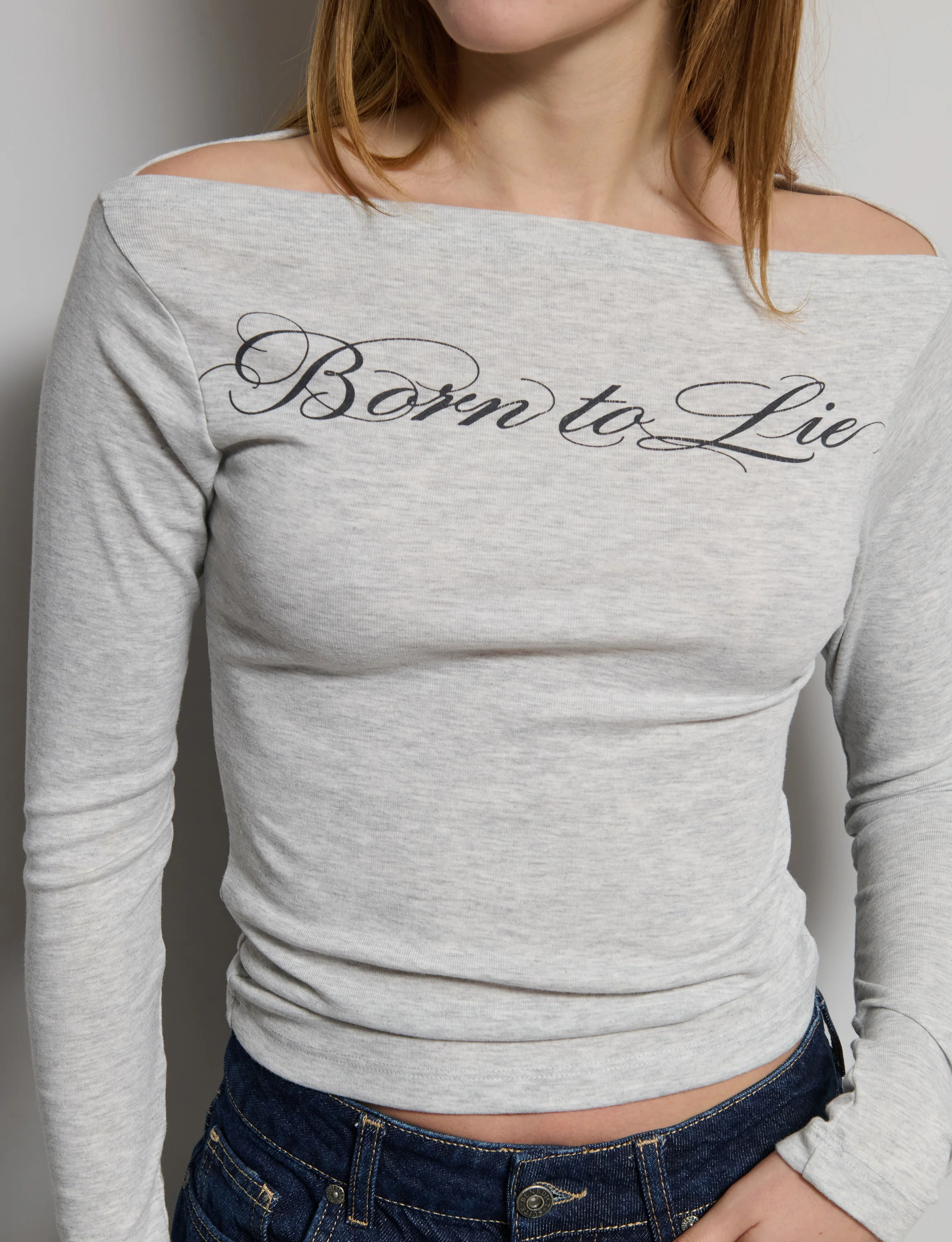 T-shirt grigio chiaro melange aderente a manica lunga in cotone, con scollo a barchetta e scritta stampata in corsivo “Born to Lie”.